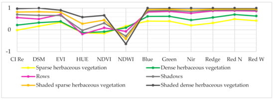 Spectral signatures of the classes. The values were scaled on a −1—1 range to facilitate the reading of the graph.