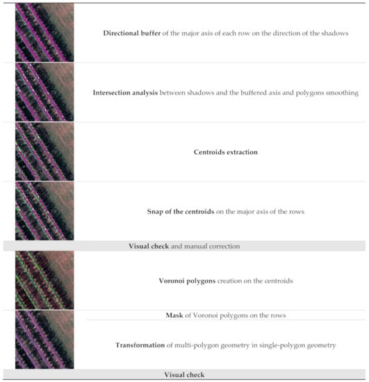 Then, the centroids were snapped on the major axis of the rows. Voronoi polygons were computed on the centroid and clipped according to the row borders. Finally, the results were transformed from multipolygons to single polygons and visually checked. Figure 6 summarises the entire segmentation process.