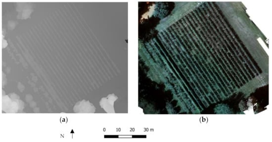 Thanks to the operations described in Section 2.3, it was possible to extract orthophoto and DSM with the pixel size of 3 cm for each of the six bands separately. Figure 7 shows the DSM and the RGB orthomosaic obtained by the multichannel visualisation of Red, Green, and Blue bands.