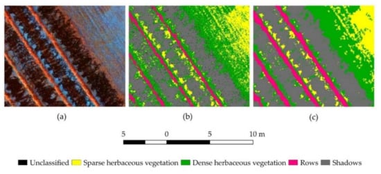 The first level classification (Classification I) was performed using the Minimum Distance algorithm, with a threshold (standard deviation from the mean) of 2-sigma for classes Rows, Shaded Sparse Herbaceous Vegetation, Shaded Dense Herbaceous Vegetation, and Sparse Herbaceous Vegetation and 3-sigma for Shadows and Dense Herbaceous Vegetation. The result was then postprocessed applying a 15-pixel sieving filter and 4-pixel dilation on the Rows class. The areas classified as Shadows were masked and used for the second classification (Classification II). It was realised with the same algorithm and settings of Classification I. The main accuracy measures based on the error matrix (Producer’s accuracy, User’s accuracy, Overall accuracy, and F1-score) were computed for both classifications using 100 randomly placed points per class. The resulting classifications were merged.