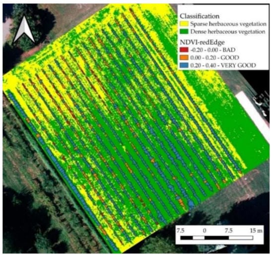 The final accuracy assessment on classification was measured on 400 points randomly placed, and it had an overall accuracy of 95% (Table 4). The Dense Herbaceous Vegetation represents the most critical classes and the Shadows as the F1-score indicates (respectively, 90% and 94%). This is mainly due to the difficulty of classification in the edge areas between the two classes. It is worth underlining that the shadows of the canopies’ upper parts are irregular and the illumination conditions are not uniform. The Producer’s accuracy is particularly low for the Dense Herbaceous Vegetation (only 0.87).