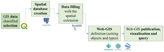 In the past decades, many works presented application case studies of GIS and WebGIS platforms to represent and query archaeological sites, built heritage, landscape, crops, and city areas with different aims and purposes (such as documentation, preservation, fruition, urban planning, and agriculture management) [43,44,45,46,47]. Many of these applications have been selected for WebGIS solutions. It is a significant GIS milestone that provides tools for people (technicians or not) to use geographic systems in real time and using the only Web mean (without installing any software). These web geographic information systems allow storing, processing, analysing, visualising, and spatial query data [42]. Furthermore, thanks to the WebGIS or open datasets from national or regional SDIs or geoportals, it is also possible to take advantage of the web services. The standards of the OGC (Open Geospatial Consortium) are internationally widespread in the field of GIS and WebGIS. They are Web Map Service (WMS), Web Feature Service (WFS) and Web Coverage Service (WCS). These concern access to data via the Web (HTTP) [48].