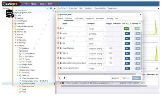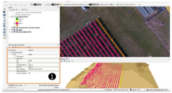 Finally, thanks to previous steps, it was possible to query the spatial data and the vineyard’s geometries, such as rows, trees, and plants, to gain all the information inserted in the QGIS project for the crop management.