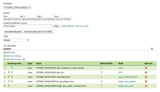Figure 13. Workspace creation for the Grugliasco vineyard WebGIS. - Inserting layers from PostGIS (vectors and raster) with their style of visualisation. slt as defined in the QGIS project;