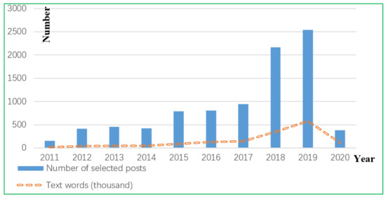 Prior to engaging in data preprocessing, the authors manually removed duplicate Weibo posts. The final dataset contained 9074 valid posts totaling 1,554,142 words (effective collection rate: 82.88%). Figure 1 presents a graphic depiction of the number of Weibo posts and words by year across the study dataset. Once Weibo removed the 140-word limit per post in late 2016, the number of posts related to ICH tourism tended to increase dramatically.