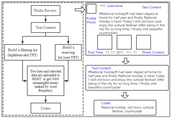 After sentiment analysis, the authors used ROST.CM6 (ROST), developed by Wuhan University, for data preprocessing. First, the authors constructed a filtering dictionary (highfreinvalid.TXT) consisting of 691 invalid words including “intangible cultural heritage”, “tourism”, and other verbs, adjectives, and adverbs. Then, an ICH list (user.TXT) containing 720 reserved words was created to cover specific forms of ICH such as “Cantonese opera”, “Mazu”, and “Lion Dance”. Finally, the two lists and all data were uploaded to ROST; 3000 meaningful nouns, ranked by word frequency, were encoded for subsequent analysis. The preprocessing phase is illustrated in Figure 2. Every post in the dataset was presented as noun codes in this step.