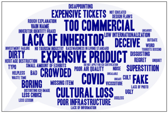 The authors imported all textual material into GooSeeker’s sentiment analysis tool, after which Weibo posts were classified as expressing positive, negative, or neutral emotions. Reviews of ICH tourism on social media were mainly positive, accounting for 88.20% (n = 8003) of the dataset. Another 11.13% (n = 1010) of reviews expressed neutral emotions, and 0.67% (n = 61) contained negative emotions. Keyword analysis of negative sentiment reviews (Figure 3) highlighted “expensive product”, “lack of inheritor”, “COVID”, and “too commercial” as the top reasons for a negative ICH tourism image. These results provide evidence that the cognition classification framework and network of ICH tourism identified in this study were mainly based on positive and neutral reviews.