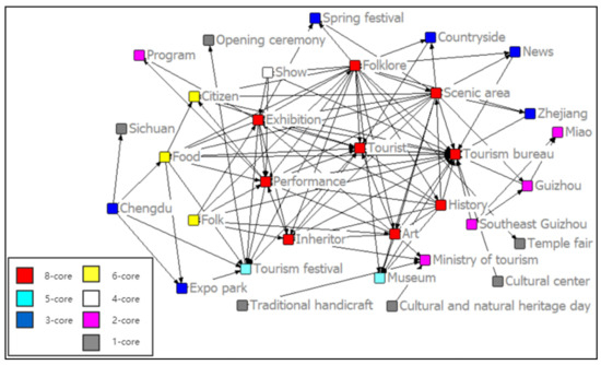 2. Import noun codes from the preprocessing phase into “ROST Social network and semantic network analysis”: The authors used ROST’s default settings and automatically generated a semantic network figure depicting ICH tourism via NetDraw software. The “Analysis-K-cores” function was employed to differentiate the core and edge structure of the cognitive network. A co-occurrence matrix, which was automatically generated in ROST, was then imported into Ucinet 6. Using the “Network–Centrality–Degree” and “Network-Centrality-Closeness” functions, the authors obtained the centrality degree and closeness degree of the network; these attributes indicated which network elements were closely connected with others and identified those features possessing the greatest influence.