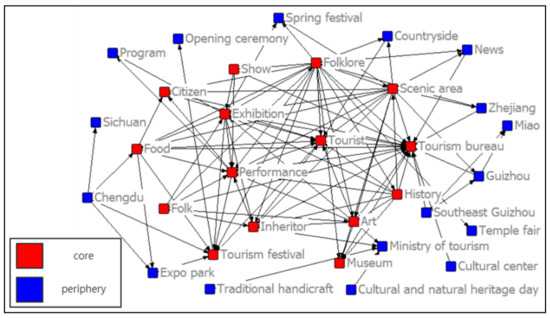 Next, to discern the core and peripheral structure of ICH tourism cognition, the authors combined the 1-, 2-, and 3-core layers into the network periphery (blue) based on the layers’ connections. The 4-, 5-, 6-, and 8-core layers were then converted into the network core (red). As shown in Figure 5, the core part (red) of the semantic network was mostly composed of 15 elements: “art”, “folk”, “inheritor”, “museum”, “visitor”, “food”, “folklore”, “history”, “tourism festival”, “performance”, “tourism bureau”, “citizen”, “scenic area”, “show”, and “exhibition”. These nodes were in the center of the semantic network and were closely connected. However, several nodes such as “temple fair”, “cultural and natural heritage day”, “traditional handicraft”, “cultural center”, “countryside”, “program”, “expo park”, “opening ceremony”, “Ministry of Tourism”, “news”, “Guizhou”, “southeast Guizhou”, “Zhejiang”, “Sichuan”, “Chengdu”, “Spring festival”, and “Miao” constituted marginal facets of ICH tourism cognition (blue), indicating that they were less connected to the network.