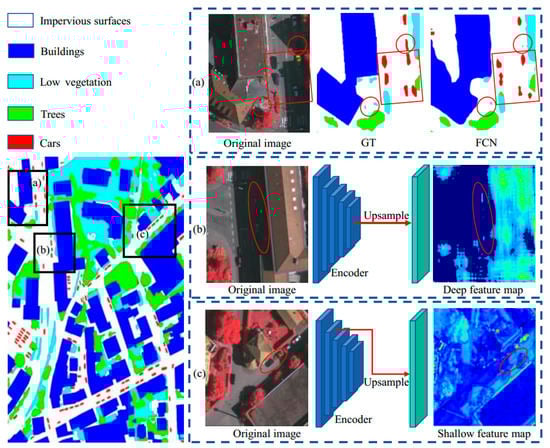 Some examples of multi-scale semantic segmentation and feature maps of remote sensing images. (a) The comparison between the ground truth and the segmentation effect of multi-scale objects in Fully Convolutional Network (FCN) is shown. (b) displays the visualization of deep feature map, in which the marked area is noise. (c) displays the visualization of shallow images.