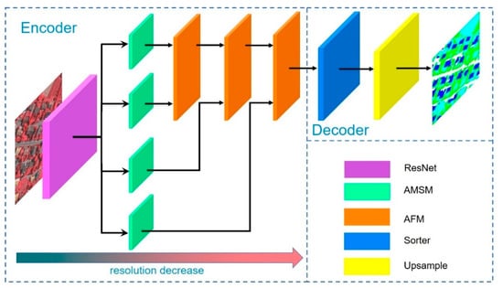 As shown in Figure 2, this network is mainly composed of three parts: ResNet preprocessing encoder based on residual block; AMSM; and AFM of attention module and upsampling block. The encoder-decoder structure is one of the most common structures in segmented networks. It is possible to extract effective global and local information by extracting high-resolution remote sensing images. In the encoder part, the network ensures the effective use of semantic and spatial information. First, we output different levels of semantic information through the Resnet101 [36] network. Then, we used AMSM stacked in the encoder part as a feature extractor. Each level performs multi-scale feature extraction on the semantic information of the fixed-dimensional image to ensure that it can be adaptively fused with the change of the image scale. Then, we used AFM to fully integrate deep and shallow semantic information. This module is a better feature extractor, designed to ensure consistent resolution. After the processing was over, the number of channels of the feature map was reduced to the same number of categories. The decoder part uses upsampling to restore the feature map to the original image size and output the final result. Facts have proven that our proposed AWNet, a new network deconstruction that combines AMSM and AFM, is very effective and practical in processing the spatial and semantic information of remote sensing images.