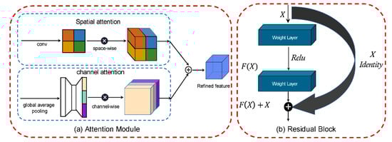 The left part (a) is the schematic diagram of spatial attention and channel attention. The right part (b) is the schematic diagram of a residual block in the residual network.