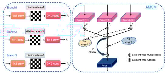 In order to overcome the above shortcomings, we propose two structures to solve these problems. Aiming at the first shortcoming, we propose an adaptive multi-scale fusion module (AMSM). Based on the classic multi-branch feature extraction, we adaptively generate different fusion weight ratios for each image according to the image scale. For example, for remote sensing images with obvious large-scale features, large-scale branches use larger fusion weights. Similarly, smaller branches are given greater weight for integration.