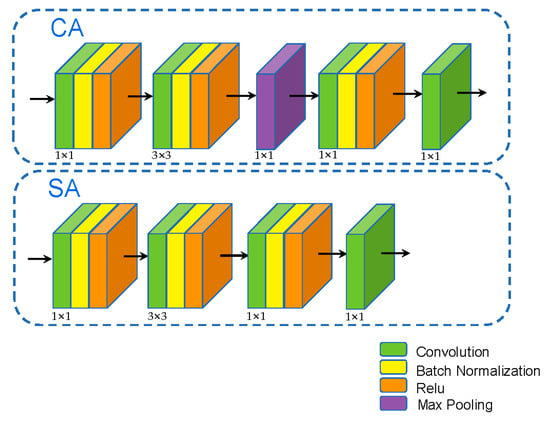 Figure 4 shows this structure in detail. It combines a spatial attention module and channel attention module. In order to fully enhance the characterization effect of the module, the two modules are combined together. The structure consists of three parallel structures, and the weights obtained using the spatial attention mechanism are then multiplied by the output of the parallel structure pixel by pixel. After that, the residual network module is used to multiply the feature graph pixel by pixel with the weight generated by multi-channel attention. Finally, the feature map is restored to the size of the original input image through the Fuse block (composed of 1 × 1 convolutional layer and 3 × 3 convolutional layer in series).