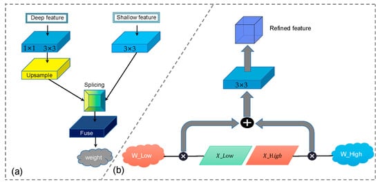 The input of AFM is a feature map of semantic information from different convolution kernel sizes. The architecture of Adaptive Fuse Module is shown in Figure 6, and the numbers marked in the figure are the size of the convolution kernel in the block. As can be seen, in this module, we got feature maps with different resolutions from two branches, namely, deep and shallow feature maps. When the combined feature map is obtained, it is necessary to ensure that the two branches maintain the same size, so it is necessary to carry out upsampling after the deep feature map to restore the feature map size. Shallow feature maps contain useful edge information and details but also annoying noise. Therefore, we filtered the shallow feature map with the help of deep features, filtering out the unnecessary noise information and only retaining the required details; we then performed the fusion operation. The weight generation process is shown in Figure 6a. The Fuse block after the fusion of the deep and shallow feature maps is three 1 × 1 convolutional layers in series. It should be noted that these feature maps will be added pixel by pixel instead of simple merging.