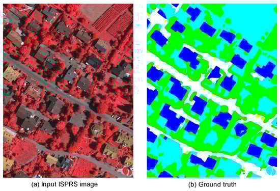 The ISPRS Vaihingen dataset is composed of 33 aerial images, as shown in Table 1. These images have a spatial resolution of 9 cm and are collected from an area of 1.38 square kilometers. In this data set, the average size of each picture is 2494*2064 pixels, and each picture has three bands of green (G), near infrared (NIR), and red (R). It is worth mentioning that, in order to achieve a generalized template, we did not use DSM data in the experiments conducted in this article. The data set is divided into training data (ID 1, 3, 11, 13, 15, 17, 21, 26, 28, 30, 32, 34) and verification data (ID 5, 7, 23, 37). Meanwhile, in our study, all the pixels in the image are divided into six categories, which are white impermeable surface, blue building, cyan low vegetation, green tree, yellow car, and red background, as shown in Figure 8.