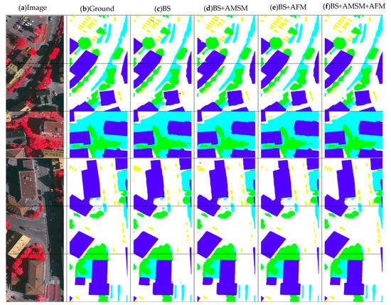 On the ISPRS Vaihingen data set, six test results for the same baseline fusion of different modules. (a) Original input image; (b) ground truth; (c) baseline output image; (d) baseline and AMSM output image; (e) baseline and AFM output image; (f) baseline and fusion of AMSM and AFM. Vaihingen’s label includes six categories: impervious surface (white), building (blue), low vegetation (cyan), tree (green), car (yellow), and chaos/background (red).
