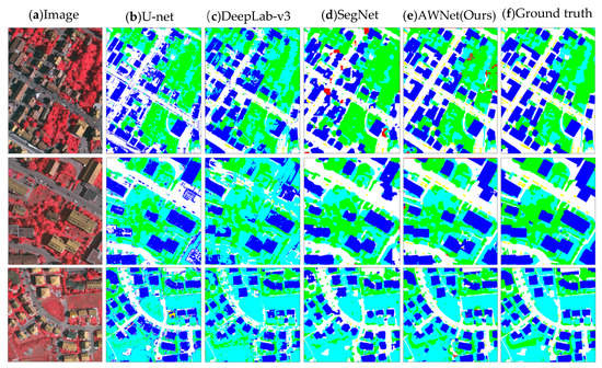 The output image of our network compared with the classic network. Vaihingen’s label includes six categories: impervious surface (white), building (blue), low vegetation (cyan), tree (green), car (yellow), and chaos/background (red). (a) Input image. (b) U-net segmentation results. (c) Segmentation result of DeepLab-v3. (d) The segmentation result of SegNet. (e) We propose the segmentation result of AWNet. (f) Ground Truth.