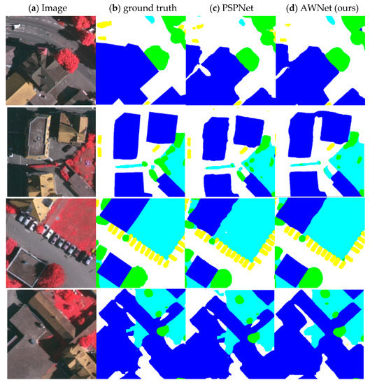 The edge prediction output of our model and Pyramid Scene Parsing Network (PSPNet). Vaihingen’s label includes six categories: impervious surface (white), building (blue), low vegetation (cyan), tree (green), car (yellow), and chaos/background (red). (a) Input image. (b) Ground Truth. (c) A partial enlarged view of the PSPNet segmentation result. (d) A partial enlarged view of our proposed AWNet segmentation result.