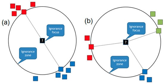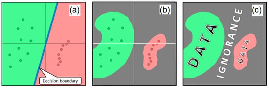 We believe that by applying not only the closed world assumption, but also the open world approach, the existing machine learning algorithms could potentially make smarter decisions and improve their results. Instead of considering missing data as a false signal, the algorithms can benefit from the knowledge of unknown regions. The driving force of learning is the process of analyzing already available data and looking for areas where the dataset has the least amount of information. Such areas without data we name ignorance zones (either data voids or confusion areas). These spaces do not provide much benefit if taken separately, but their shape and size can help us to understand accessible data better, make the analysis of them more efficient, and even discover new classes of them. Therefore, we consider ignorance to be a more generic concept compared to uncertainty. If (according to the Closed World Assumption) we fix the number of different classes in advance (like the two classes in Figure 1a), then the classifier categorizes every point in the space with some level of uncertainty, which shows how confident the classifier is with its output. The closer the point is to the decision boundary between the two classes, the higher the uncertainty, up to 50–50 at the decision boundary. In the case of the Open World Assumption, we can also be uncertain at some points about which of the known classes must be applied there and with which level of confidence. However, at the same time, we can be ignorant of whether any of the known classes are the right output or, probably, whether this particular point is the instance of the new, yet unknown class. Therefore, ignorance includes uncertainty as a possible scenario together with potential confusion on the completeness of the available class labels set.