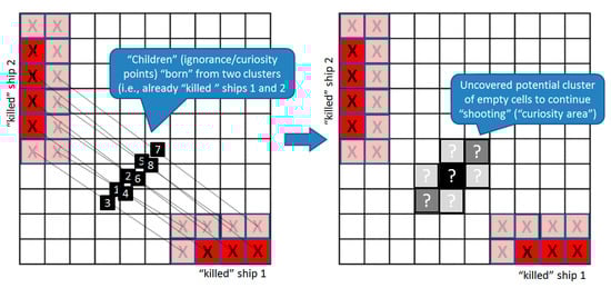 As we already mentioned, the discovered ignorance zones can be treated as potential curiosity areas. A simple example in Figure 5 presents a situation from a popular “Battleship” game. In this game, players are more interested not in the ships (“cell clusters”) discovered and “killed” already, but rather in empty spaces, where yet uncovered ships of the opponent might be located. Here, in the figure, one can see two already killed ships, and now the decision is being made of where to shoot next, i.e., which parts of the remaining voids we are curious to explore with the next shot. If we use the kNDN algorithm and consider the two known areas around the killed ships as two different manifolds of data, then their valid children (curiosity points), “born” in a numbered order, can be seen in Figure 5. One possibly reasonable place to shoot next would be within this curiosity zone.