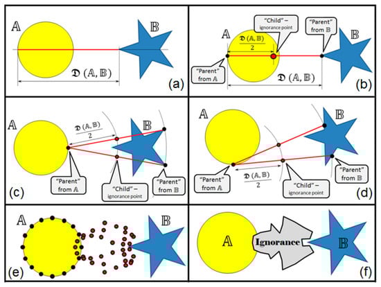 - For each pair, the “child” (ignorance boundary point) is created, which is located exactly in the middle between parent points (Figure 6b–e).