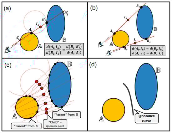 Consider yet another way to compute the ignorance points using the whole shapes of the manifolds in 2D. We name it the balanced view method. It allows computing the ignorance curves (i.e., the decision boundaries) between the manifolds. The method is illustrated in Figure 7. For a couple of manifolds, and , the following rules are applied (in terms of a genetic algorithm):