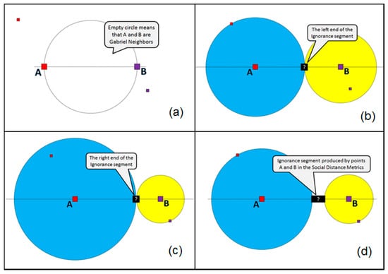 First (Figure 8a), we find the suitable parents A and B for the ignorance point (i.e., the Gabriel neighbors). According to the Social Distance Metric, the intended “middle” point “?” would be the one with the following properties: it is located on the line connecting A and B; the circle centered in point A and touching the point “?” and circle centered in point B and touching the point “?” have the same number of homogeneous (by color/label) data points (exemplars) within them. In a generic case, either one or several (infinite number within some interval) points may fit such a rule. Therefore, the result for A and B will be a line segment. Figure 8b shows the existence of the left end of such a segment, and Figure 8c shows the existence of the right end of the segment. The resulting ignorance zone (line segment) for A and B (as parents) is shown in Figure 8d.
