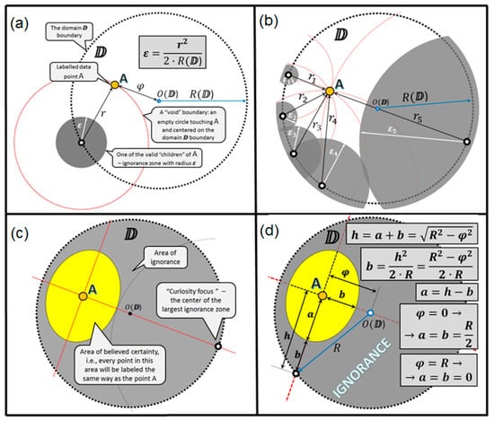 Figure 9 illustrates the origin of all the ignorance zones around the unique data point A, which is located somewhere within the domain so that the distance between and A is equal to . All the ignorance zones (Figure 9a,b), when merged (see Figure 9c), form a solid area of ignorance around point A. With a simple geometry (Figure 9d), one may see that the ignorance zones remain in some untouched space (we name as a believed certainty area), which is an ellipse centered in A and having parameter a as semi-major axis and b as semi-minor axis computed as follows: