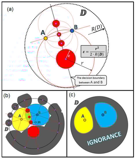 Figure 10 illustrates the origin of all the ignorance zones created due to the conflict (different tags or class labels) between two data points A and B within the domain. Here in Figure 10, as well as in the previous case shown in Figure 9, we have to consider circular voids (empty circles) centered on the decision boundary; however, in the case of two conflicting points, the decision boundary is not only the domain boundary, but it is also the line that goes via the points equidistant from A and B. All such voids, which touch both A and B and are placed completely within the domain, make additional ignorance zones marked by red color in Figure 10a and sized similarly to the previously seen voids created due to the conflict between a unique data point and the domain boundary (Figure 9). If we combine/merge both types of voids and their ignorance zones (Figure 10b), then we will get the solid area of ignorance together with the two spots of believed certainty (Figure 10c). In the yellow spot around the point A, we believe that all the points (potential test queries) will be tagged (classified) the same as the data point A; and, in the blue spot around point B, we believe that all the points will be classified as the same class as the data point B.