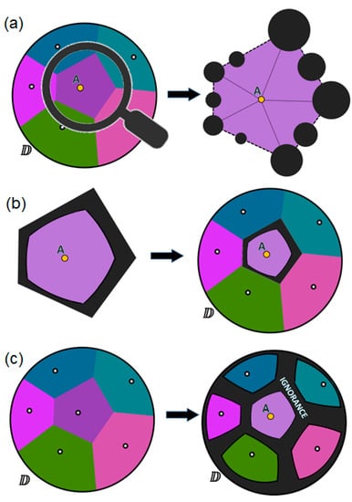 In Figure 11, we see an example of the domain with six differently tagged data points located within it and represented with a Voronoi diagram. Let us take one of the cells to start with (Figure 11a). This cell looks just like a kind of domain containing one point. Therefore, we can assume that all potential ignorance zones that are based on the position of this point in its immediate vicinity will be centered on the Voronoi cell boundary, and the size of these zones can be calculated using the technique described above. The scaling factor , which is the size of the global domain , remains the same for all the computations. All such zones when merged (Figure 11b) form an ignorance area around each point within each cell. Finally, we get a kind of “ignorance-aware” Voronoi diagram, in which the ignorance zones and the zones of believed certainty are clearly indicated (Figure 11c).