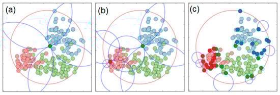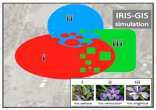 For the further experiments, we decided to inject the GIS context into a couple of previously considered datasets from the UCI repository (“Iris” and “Wine”). We used the built-in approach [43], in which an existing non-spatial dataset is extended by injecting spatial awareness [44] into it. In the original Iris dataset, there are three classes of irises with 50 samples in each class. Figure 15 illustrates the three intersected artificial spatial areas, within which all the 150 irises were randomly distributed so that their spatial coordinates have been captured and added to the dataset. As a result, we got the new dataset (named IRIS-GIS) for our further experiments, the same way we did to made spatial update of the Wine dataset to the WINE-GIS dataset. Our intention was to enable more challenging prototype selection cases for our IPS and APS algorithms vs. CNN and ENN algorithms within the GIS context.