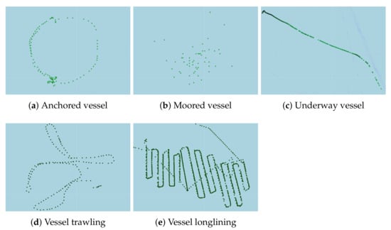 Underway: During this type of activity, a vessel is traveling from a departure point to a destination point. A vessel is considered underway when it is not aground, anchored, or has not been made fast to a dock, the shore, or some other stationary object. An underway vessel is not necessarily propelled or pushed by an instrument or a device, but it may be underway because of the wind or the sea current [,]. Figure 1c shows the trajectory of an underway vessel. The movement patterns of an underway vessel typically form straight, curved, or zigzag lines, which can occur when a vessel avoids islands in the middle of the sea.