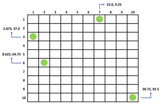 Therefore, each AIS position is placed inside a normalized bounding box or a surveillance space of size , which is essentially an image representation. Figure 2 demonstrates an example of the surveillance space normalization for . Each green circle corresponds to an AIS position where the corresponding longitude and latitude are denoted by the blue arrows. The total horizontal distance is , while the total vertical distance is . Based on Equations (3) and (4), of the upper right AIS message is equal to , and is equal to 0. According to Equations (5) and (6), is equal to , and is equal to 0. Multiplying each normalized value by results in and . In order to fit boundary AIS positions into the normalized surveillance space, pixel values smaller than N are transformed into 1, and pixel values larger than N are transformed into N Therefore, is transformed into 1, and the final pixel position inside the image is and , as shown in Figure 2.