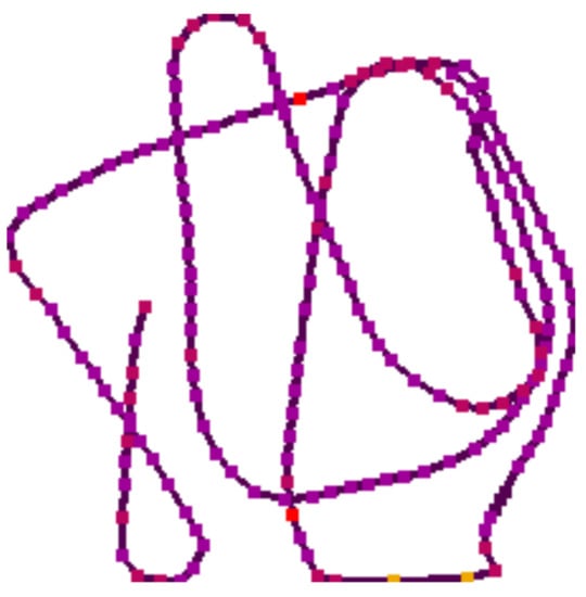 The range of speed regarding the most common vessel types such as passenger, cargo, or fishing varies between 0 and 22 knots, . In order to represent the speed values of each AIS position m, the range R was segmented into 2-knot increments with each increment corresponding to a different RGB color value in the final image. The 2-knot increment was chosen because we wanted a reasonable amount of color values (11 distinct color values against 22 color values with 1-knot increments) while maintaining a relatively high number of increments. Therefore, the color values were different for dissimilar speed values of AIS positions. Furthermore, the speed of the fishing vessels varies between 2 and 4 knots [,]. which corresponds to a 2-knot increment. Sometimes, speeds exceed the R range; thus, speed values greater than 22 knots have the same color as the last increment (). Moreover, pixels that do not contain an AIS position or a line drawn by Bresenham’s line algorithm are colored white, and pixels that contain the lines between the AIS positions use the color of the first increment. As a result, there are 12 color values in a trajectory image. An example of a trawling trajectory is shown in Figure 3. Finally, it is worth noting that the transformation of a trajectory into an image adds a negligible overhead.