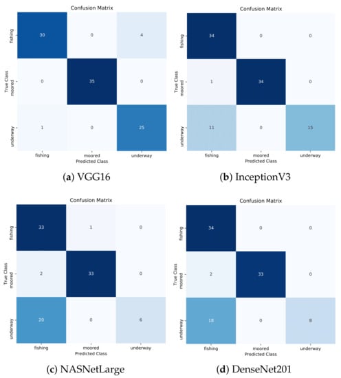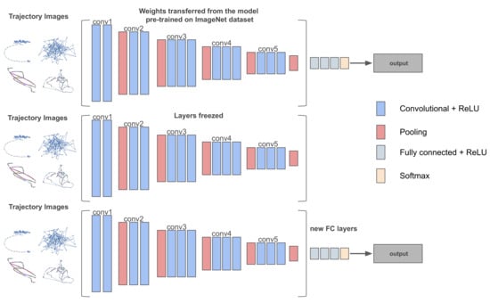 CNNs do not require hand-created feature extraction, and deep features of trajectories such as shape and color (e.g., speed) can be learned by the CNN automatically. As stated in [], neurons in the CNN receive signals from other neurons in the local area in the preceding layer; thus, the CNN is able to capture more local spatial correlations. Furthermore, the weight-sharing characteristic in the connection of adjacent layers can significantly reduce the number of variables. The main disadvantage of deep learning approaches regarding image classification is that they require a large amount of data in order to perform accurate feature extraction and classification. In order to overcome this limitation, transfer learning was adopted. Transfer learning is a common and effective method, which aims at training a network with fewer samples, as the knowledge extracted by a pre-trained model is then reused and applied to the given task of interest. The intuition behind transfer learning is that generic features learned on a general large data set can be shared among seemingly disparate data sets. The learned features can be used to solve a different, but related task [].