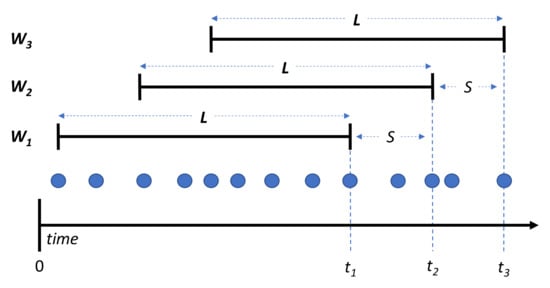 The prediction modules were the main components of our methodology. Each prediction module was responsible for consuming AIS messages from a set of vessels and classifying parts of their trajectories based on the deep learning model created in the previous phase. To classify parts of the vessels’ trajectories, the module used a temporal sliding window W of user-defined length L and step S. Every S AIS messages, the module took into account all of the AIS messages of the corresponding vessel that belonged to the current window W and converted them to an image. Next, the deep learning model read the image and output for each of the predefined vessel activities a probability. The vessel activity with the highest probability was the final prediction of the module. Figure 5 illustrates the sliding windows of the prediction modules. A window of length L and a step of events is illustrated, which slides from left to right ( to ). The upper temporal limit of the window is the time t the incoming message was consumed, and the lower temporal limit of the window is L hours/minutes/seconds before t, . Messages that fall within the window W were used for the prediction.