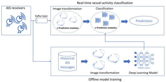 Finally, Figure 6 visualizes the entire system architecture of our proposed methodology. Initially, historical AIS messages that were collected from AIS receivers were transformed into images. These images were then used to train a deep learning model offline. For the real-time classification, messages received through the AIS receivers were stored in a Kafka topic. These messages were then consumed by the prediction modules and transformed into images, which were fed to the already trained deep learning model for the prediction of the vessel activity. During the real-time vessel activity classification, more than one prediction module can be employed to increase the throughput of the system.