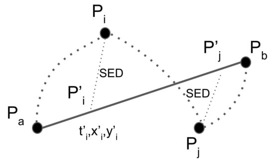 Despite the popularity of line generalization algorithms in the fields of cartography and computer graphics, the main drawback when dealing with trajectory data of moving objects is that they do not consider the temporal aspect. The spatial error finds the closest point on the compressed representation of a trajectory to each point on the original trajectory. Each trajectory is treated as a line in two-dimensional space. However, a trajectory incorporates an important extra dimension: time. Meratnia and By [] proposed the time ratio algorithm, which computes the distances between pairs of estimated temporally synchronized positions, one on the original and one on the corresponding approximated trajectory, as illustrated in Figure 8.