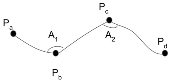 The heading-based algorithm exploits the angle formed by subsequent segments of a trajectory. Initially, the distances between continuous points are calculated. Then, for each triangle formed by three continuous points like , the distance length of the opposite side of the examined angle is calculated, e.g., , and the law of cosines is used in order to find the angle, e.g., as , where denotes the angle contained between the sides of length a () and b () and opposite the side of length c (). If the angle of two subsequent segments is greater than a user-defined threshold, the point in the middle is retained, otherwise discarded. The algorithm is illustrated in Figure 10.