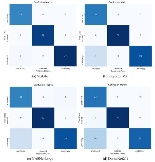 Offline model training: In this phase, the deep learning model was created as described in Section 3.3. For the training of the model, representative trajectories of the mobility patterns were required to be used as the ground truth. Thus, already labeled trajectories from historical AIS data, which were annotated as “anchored”, “moored”, “underway”, and “fishing”, were used. These trajectories were converted into images, which in turn were used as training instances of the deep learning model. For the implementation, the Keras (https://keras.io/, accessed on 7 April 2021) library with a TensorFlow (https://www.tensorflow.org/, accessed on 7 April 2021) backend was used, which consisted of not only APIs to create neural networks, but pre-trained CNN models as well. These pre-trained models were employed and fine-tuned to classify images of mobility patterns in the next phase.