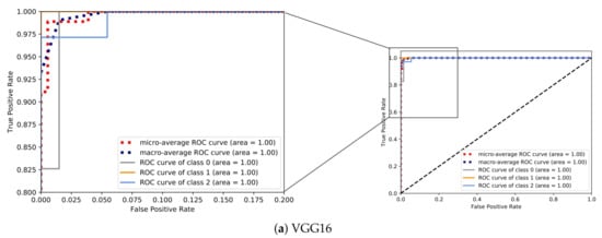 In this research work, fine-tuning was employed as the standard method for transfer learning. The weights were pre-trained on the ImageNet [] data set for all the deep CNNs. Figure 4 illustrates the fine-tuning process on the VGG16 network. The same process was applied to all the examined deep learning models. The VGG16 model contained 13 convolutional () and 3 fully connected () layers. The final set of layers that contained the layers along with the activation function is called the “head”. The network was instantiated with weights pre-trained on ImageNet, as shown at top of the figure. Afterwards, the layers were truncated, and the final layer was treated as a feature extractor, as depicted in the middle of the figure. Finally, the truncated layers were replaced by a new head layer, which was randomly initialized and placed on top of the original architecture (bottom of the figure). Then, the model was trained through a backpropagation process. The body of the network, i.e., the weights of the layers of the pre-trained network, were frozen such that only the head layer was trained. This was because the layers had already learned discriminative filters and captured universal features like curves and edges; thus, these weights had to remain intact. On the other hand, the head layer was randomly initialized from scratch and focused on learning data set-specific features; thus, random values were able to destroy the learned features. Early-layer features appeared more generic, whereas later features progressively became more specific to a task [].