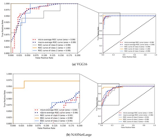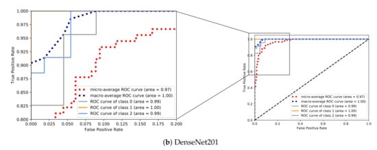 The most commonly used technique regarding computer vision includes convolutional neural networks [], where each layer of the network identifies a different aspect of the image. In an attempt to improve the performance of neural networks, deep learning [,,] has been adopted, which increases the complexity of the neural networks by adding more hidden layers and nodes. Deep learning can be used for both classification and feature learning in various fields and is rapidly becoming the state-of-the-art technique, leading to enhanced performance []. The Convolutional Neural Network (CNN) is a kind of deep learning technique that has achieved remarkable performance in the field of computer vision [], as well as in various medical applications [,,]. According to [], CNNs can handle four different aspects: training the weights from scratch, fine-tuning, feature extraction, and unsupervised pre-training. Deep convolutional neural networks are among the powerful deep learning architectures and have been widely applied in a broad range of machine learning tasks. The first CNN to create a standard “architectural template” was LeNet-5 [], which uses two convolutional layers and three fully connected ones. Ever since, the same idea has been applied to more architectures by adding more convolutions and pooling layers, ending with one or more fully connected layers such as AlexNet [] and VGG-16 []. AlexNet was the first CNN architecture that implemented Rectified Linear Units (ReLUs) as an activation function []. On the other hand, VGG-16 used 13 convolutional layers and three fully connected ones, keeping the ReLUs from AlexNet as an activation function. In the years that followed, architectures became deeper and more complex by introducing several techniques inside the layers of the networks. Inception-v1 [] utilizes 22 layers and a “network inside a network” approach by using “Inception” modules. The idea behind this approach was motivated by Arora et al. [], who suggested an architecture that analyzes the correlation statistics of the last layer and clusters them into groups of high-correlation units. These Inception modules use parallel towers of convolutions with different filters, each filter capturing different features, and then cluster these features together. Inception-v3 [] and Inception-v4 [], which constitute the successors of the initial Inception network, added more Inception modules and made some modifications to improve the training speed. In [], the Inception modules were converted to residual Inception blocks, introducing a new deeper architecture called Inception-ResNet-v2. ResNet-50 [] along with Inception-v3 were the first networks to use batch normalization and furthermore contained two even deeper architectures, ResNet101 and ResNet152 with 101 and 152 layers, respectively. Xception [] replaced the Inception modules with depthwise separable convolutions. This means that it performed convolutions on every channel and then performed a convolution on each output. In DenseNet [], each layer obtains as the input the feature maps of all preceding layers. Thus, each layer receives a “collective knowledge” from all preceding layers. Finally, NASNet [] contains two architectures, NASNetMobile and NASNetLarge, which differ in the input size of the training images. The main components of NASNet are two types of convolutional cells: normal cells, which return a feature map of the same dimension, and reduction cells, which return a feature map where the height and width are reduced by a factor of two.