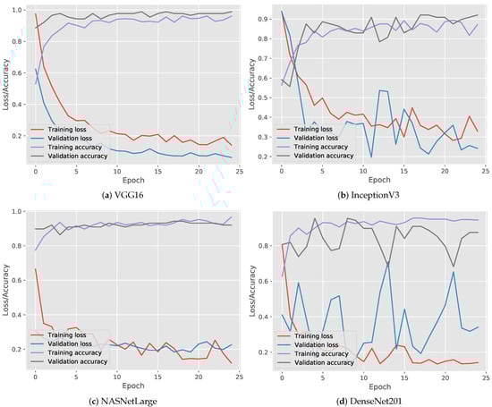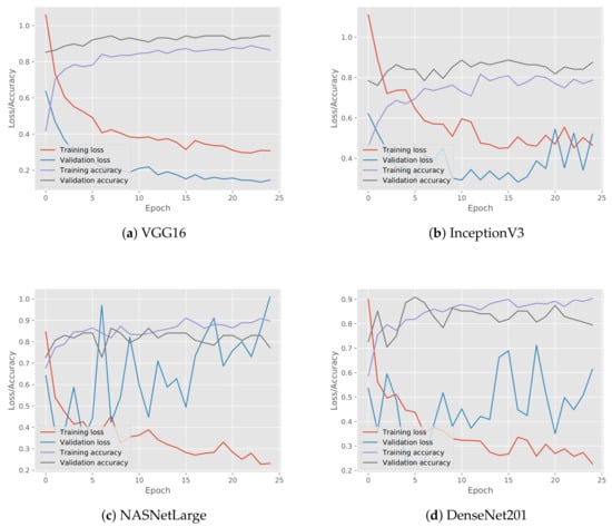 Examined CNNs were compiled utilizing the optimization method called Adam [], which finds the minimum of the objective (error) function making use of its gradient. Furthermore, a dropout layer [] of 0.5 was applied, which means that 50% of neurons were randomly set to zero during each training epoch, thus avoiding overfitting on the training data set. Dropout is one of the most popular regularization techniques, which forces the weights in the network to receive only small values. making the distribution of weight values more regular. As a result, this technique can reduce overfitting on small training examples []. Another efficient way to prevent model overfitting is data augmentation, which increases the amount of training data []. Thus, data augmentation was performed during training, leveraging several multi-processing techniques. Specifically, the transformations employed included random rotation of the images (the maximum rotation angle was 30 degrees), horizontal flips, shearing, zooming, cropping, and small random noise perturbations. Data augmentation improved the generalization and enhanced the learning capability of the model. Table 1 summarizes the parameters employed by the different deep CNNs.