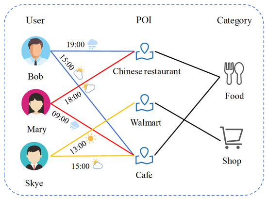 An example of Location-Based Social Network (LBSN) Heterogeneous Information Network (HIN) of user-Point-Of-Interest (POI)-category with contexts of time and weather.