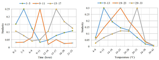 As shown in Figure 2, the 24 h of a day and the temperature (weather) range are divided into 8 slots, and the similarity of the three context slots with other slots analyzed, where the similarity between the same contexts slot is 1. As seen from the figure, the similarity between closer context slots is higher. Therefore, the semantic tensor can be smoothed based on the user behavior similarity between different context slots by giving higher weights on its neighboring slots: