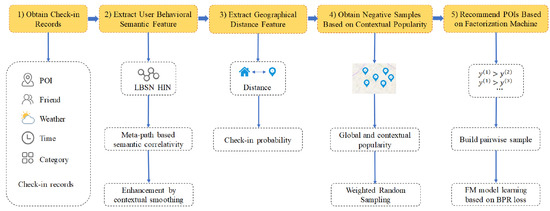 The Factorization Machine (FM) [25] was proposed to solve the feature combination problem under large-scale sparse data. For the context-specific recommendation scenario, user check-in data is segmented by context information such that the data is further sparse. Moreover, the user’s behavioral features may affect each other, so the Factorization Machine is very suitable for the target scenario of this paper. For the implicit feedback scenario of LBSN, a weighted random sampling strategy is proposed based on the popularity of POIs, and Bayesian Personalized Ranking [26] is employed to train the Factorization Machine model. The process of the recommendation model proposed in this paper is shown in Figure 3.