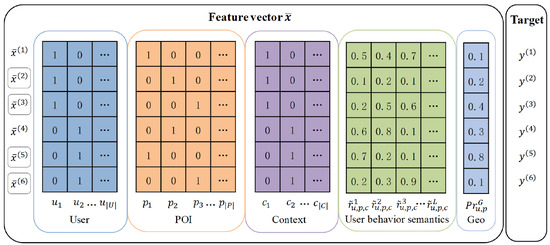 Figure 4 presents an example of the extracted samples and features, where each row indicates a sample. The sample feature vector consists of five parts. The first part is the user’s One-Hot encoded binary vector, the length of which is the total number of users . Similar to the first part, the second and third parts are binary vectors whose length is the total number of POIs and the total number of context slots respectively. The fourth part is the user behavioral semantic features of length L, where each dimension represents the feature value in the user behavioral semantic tensor extracted by a certain meta-path. The fifth part is the distance-based check-in probability introduced in Section 4. The target represents the predicted value of the feature vector , i.e., the predicted preference of a certain user on a certain POI, in the Factorization Machine. As an illustrative example, Figure 4 gives two positive samples, i.e., and with their corresponding feature vectors and . For , it has two negative samples, and with their feature vectors and , which are framed in Figure 4. Similarly, has two negative samples, and with their feature vectors and .