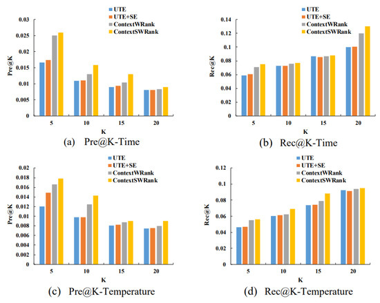 Performance Comparison. As shown in Figure 5, the precision and recall of different methods is compared, considering the time and weather (temperature) contexts when the context slot is set to 8. As it reveals, UTE+SE exhibits better results than UTE in most cases, which demonstrates the effectiveness of considering geographical influence. Meanwhile, ContextWRank outperforms UTE and UTE+SE, in terms of Pre@5 at time comparison, by 50.3% and 44% respectively. Furthermore, with the enhancement of contextual smoothing, ContextSWRank shows the best performance in all cases.
