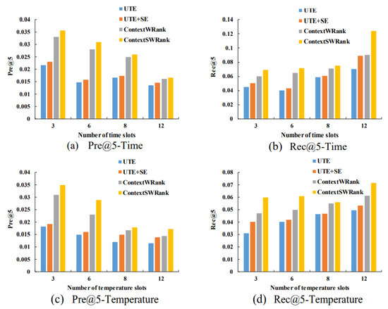 Effect of the Number of Context Slots.Figure 6 compares the precision and recall with the different numbers of context slots from 3 to 12 when considering time and weather (temperature) contexts. Obviously, the smaller number of slots, the less context-specific it is. As Figure 6 indicates, when the number of context slots is set to 3 or 6, Pre@5 achieves the best and Rec@5 achieves the worst for all methods. When the number of context slots increases, Pre@5 drops whereas Rec@5 increases in general. Finally, Pre@5 reaches the worst and Rec@5 reaches the best at 12 context slots for all methods. The reason may be that the more slots, the sparser the data will be, which leads to the recommendation become more difficult. On the other hand, the increasing number of slots makes the number of ground truth of POIs become fewer for each slot, thus leading to the better recall. Most importantly, ContextWRank and ContextSWRank always achieve the better performance than UTE and UTE+SE no matter how many context slots there are, which further proves the effectiveness of the proposed method.